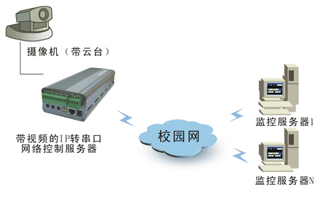 注:摄像机可以采用一体化摄像机,也可用普通摄像机外加云台和解码器,带视频的串口IP网络服务器提供232或485的云台控制接口,网络允许有多个监控服务器同时工作,一个监控服务器最大可做80个教室的硬盘录像.